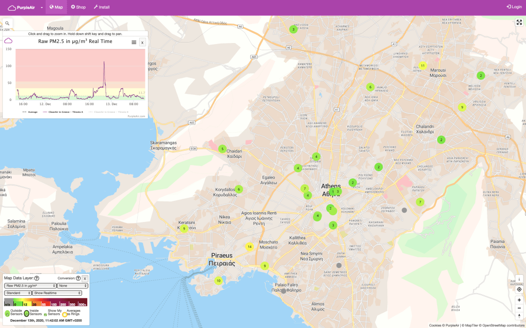 Just have a look at the AQ graph and map of Athens below, which shows the Air Quality at our AQ Monitor Station of Thiseio for the days of 12-13 December 2020. You see a spike in Particulate Matter PM2.5 (the nasty one!) in the evening of the 12th (due to the wood smoke coming from the thousands of wood stoves and fireplaces) that started at around 20:00PM. Then you see a sharp, sudden drop of the PM2,5 at around 22:30. That sharp drop is due to the rain. When the rain started, the water falling from the sky literally caught the PM2,5 particles to the ground with it. And the air remained clean for a few hours until the rain stopped.