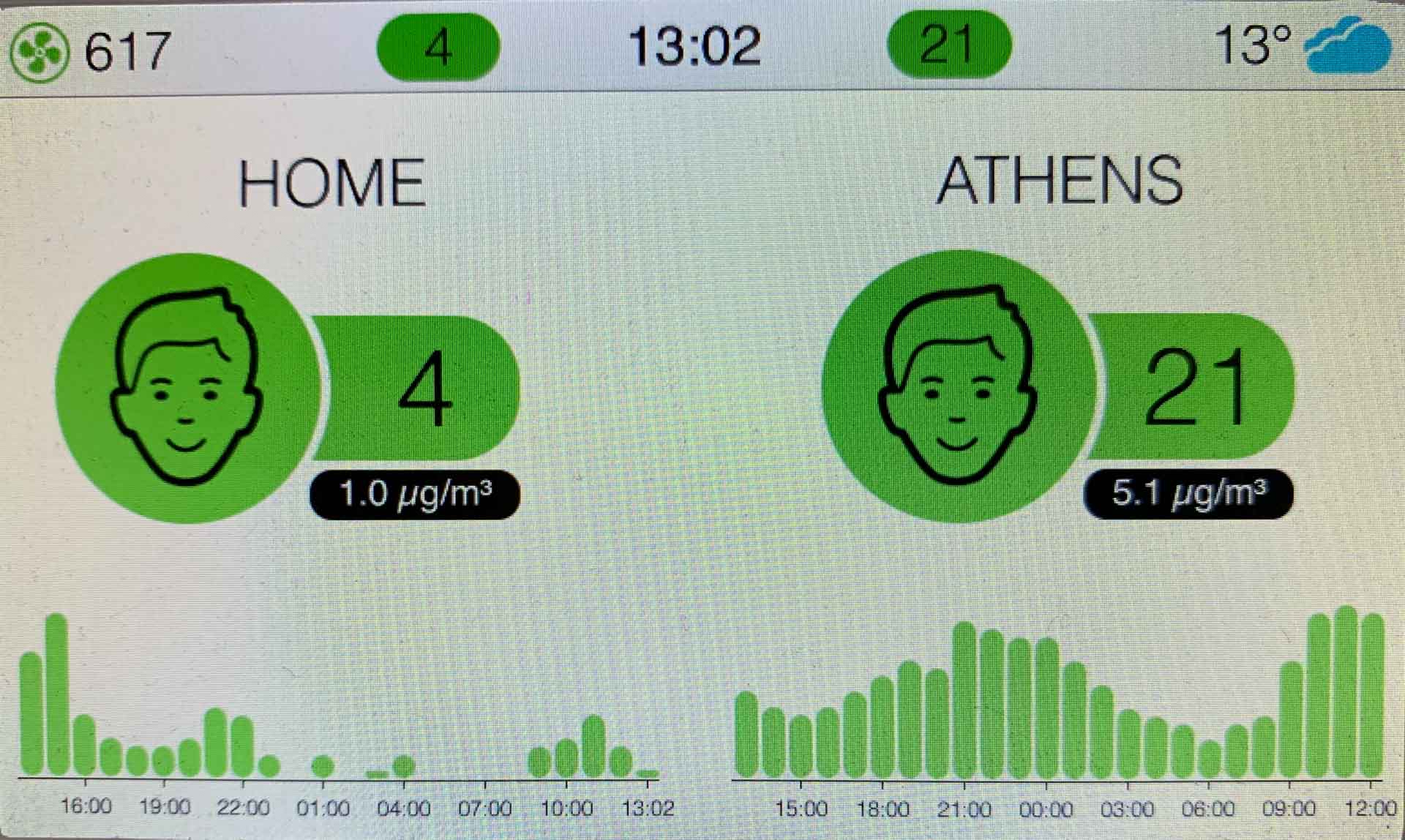 – the second picture to the right shows the 24h progress of the Air Quality from yesterday at 16:00 until today at 15:00. PM2,5 is lower than 10 μg/m3 at 16:00 (green bar), then it reaches 120 μg/m3 at night (red bars) and falls again the next day to levels below 10 μg/m3 (the last green bar).