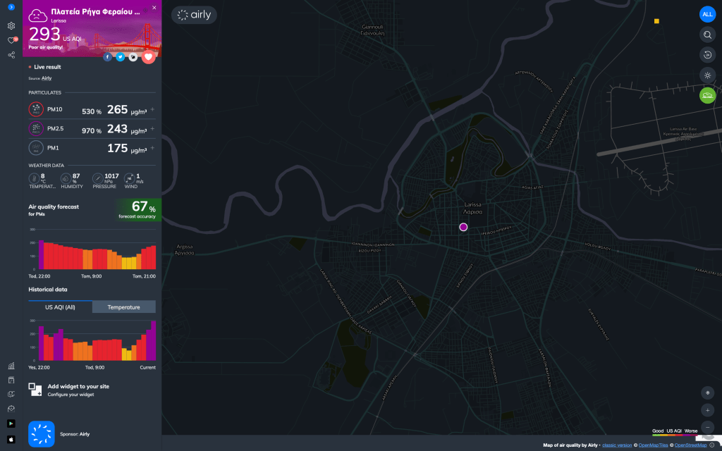 When looking at the only Air Quality sensor in Larisa whose activity is visible in real time by anyone on the Airly website (https://airly.org/map/en/#39.635407,22.41419,i15580), one can only wonder what the hell is going on there.
