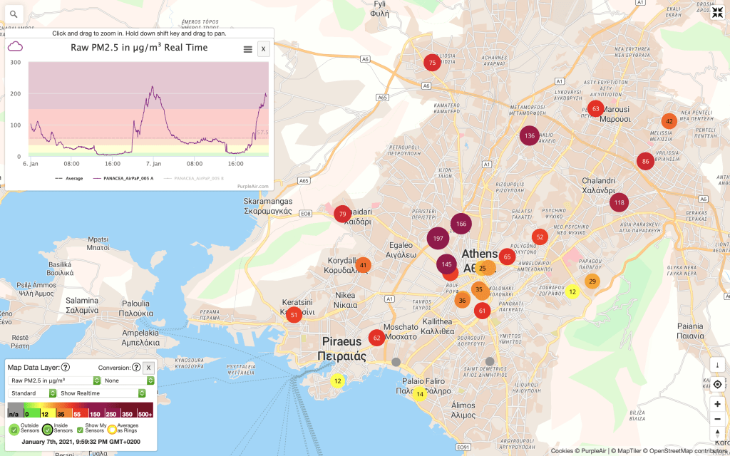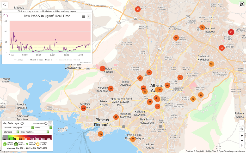 In fact, the homogeneity of the PM2,5 at a value around 40 μg/m3 in the map of Athens tonight indicate that the dust is similarly spread across the city and that fireplaces and wood stoves are for the biggest part off.