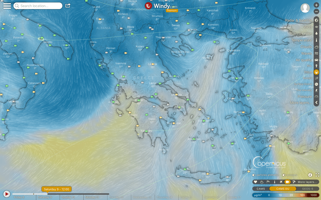 Have a look at the Windy map below to see how the dust (in yellow) is blown across the Mediterranean Sea by the southerly winds …