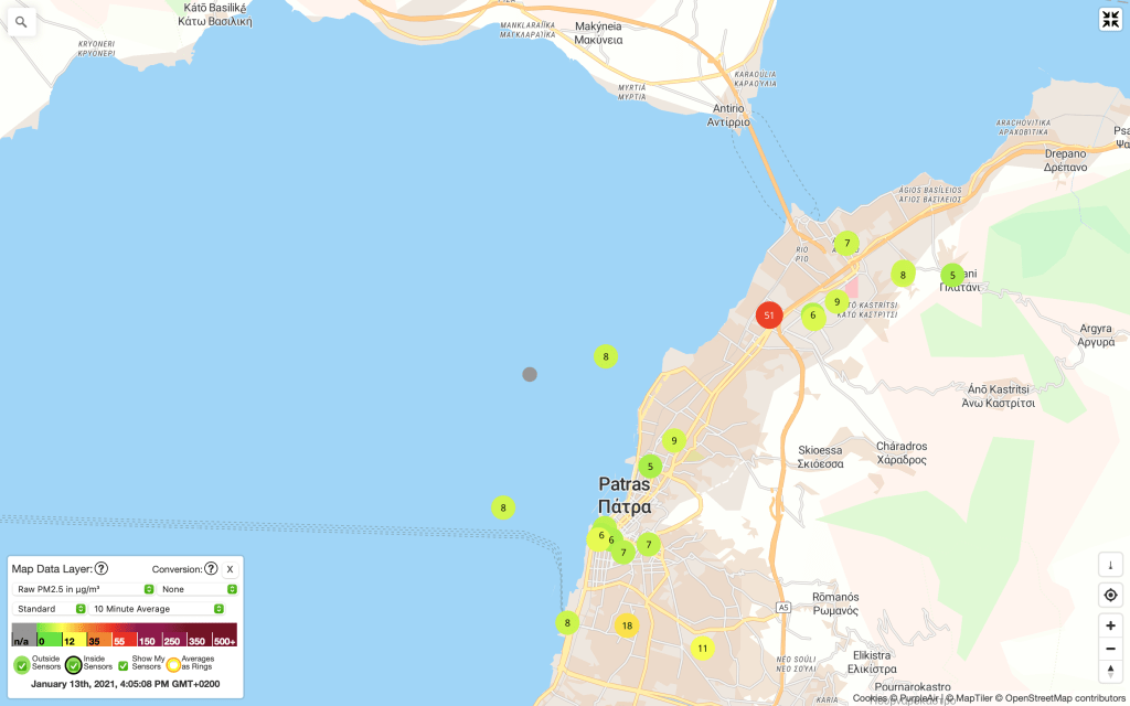This is a very good example that shows how Air Pollution is often a very localized phenomenon. Just one house with a lit wood stove or fireplace is enough to create uncomfortable situations to the neighbours. Imagine if these neighbours had the knowledge given by a simple Air Quality monitor like Purple Air and its map feature, and understood that they are the unlucky ones to be in the wrong place of the whole region. Because they could’t open the windows yesterday, while all other around them in Patras could. I would have felt very unlucky if I was them.