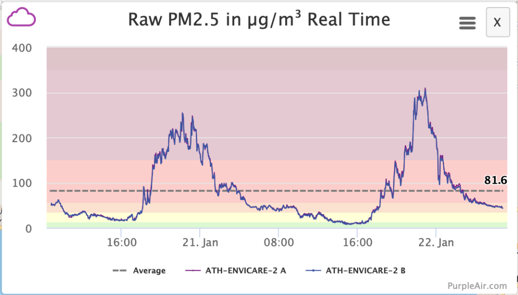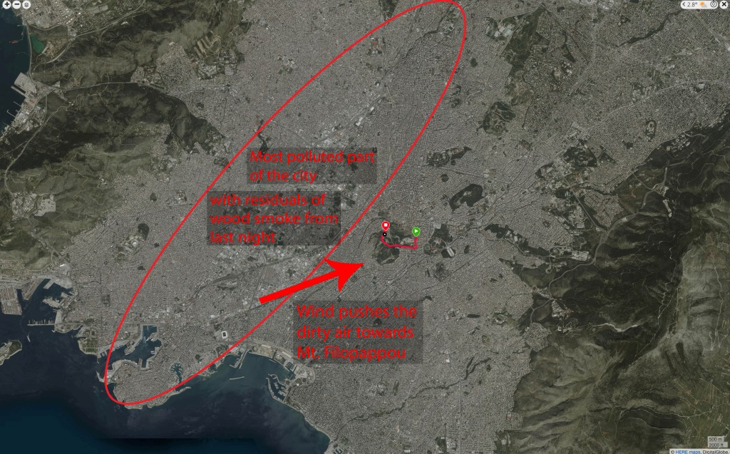 This phenomenon actually happens several times in winter, when the weather is fair with a SW breeze as the main wind, which simply pushes the dirty Air towards the Filopappou Hill, making its Air temporarily dirtier, until it is finally blown away later on. If the wind picks up during the day, like during these past two days, then it manages to clear out the air completely so that we can enjoy clean air during a few hours until the evening comes and residents light their fires again. If the breeze remains light, then the air doesn’t clear out and in fact the Particulate Matter builds up, making the next days and evenings even more polluted – until a new wind or rain comes and clears out the air again.