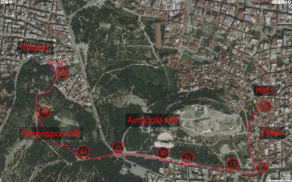 It is really surprising that even within a pedestrian zone and a green park in central Athens, the Particulate Matter (PM2,5) in the air could increase fivefold from 10 to 50 μg/m3, which is a very big difference, in just such a small distance.