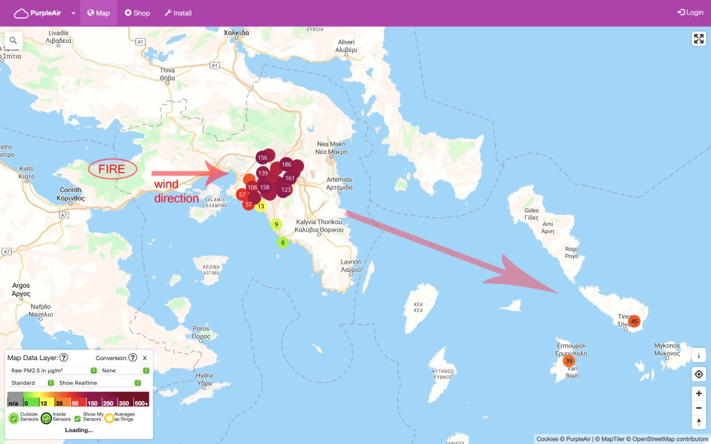 The wildfire smoke from a pine forest near Korinth that reached Athens today afternoon reached also the N Cyclades, as it is clearly visible on the PurpleAir map here below.