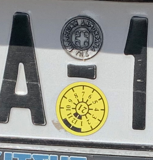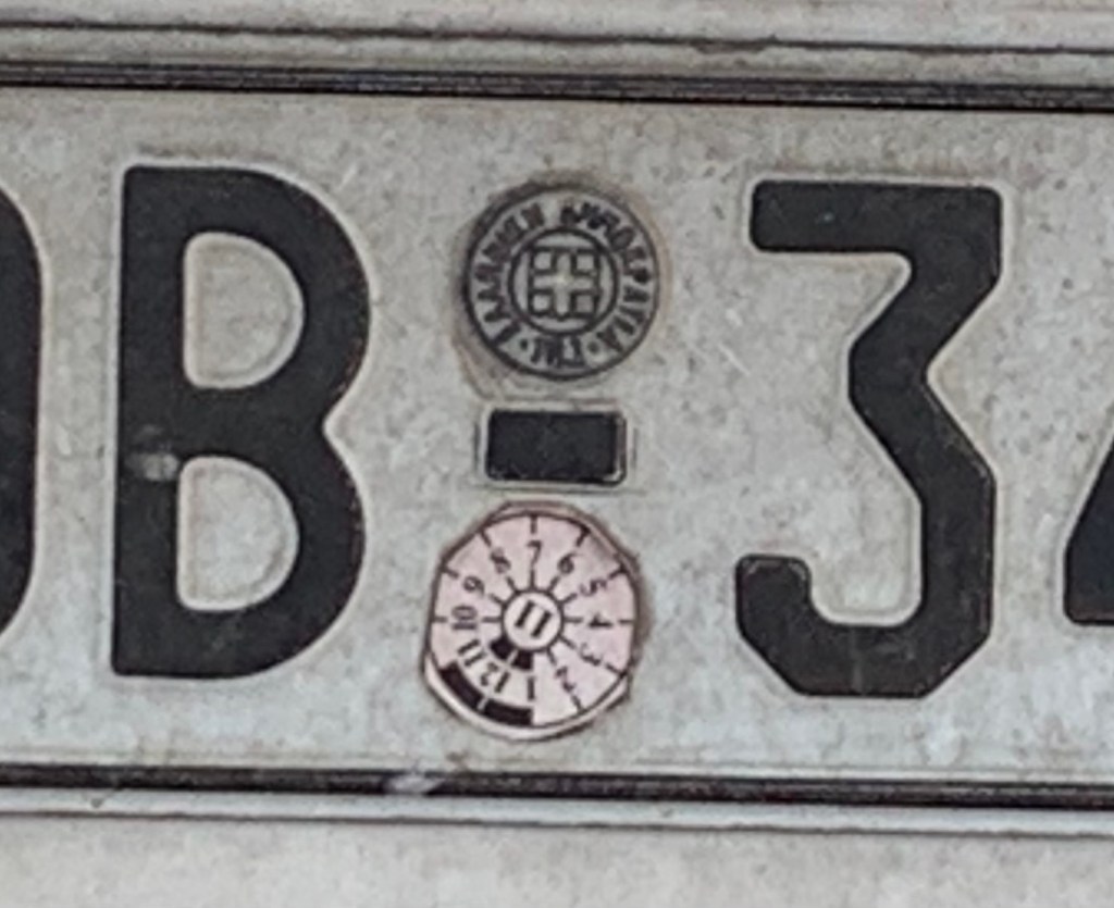 Pictures of some old MOT stickers on the license plates and pictures of the typical old cars circulating in Greece today.
