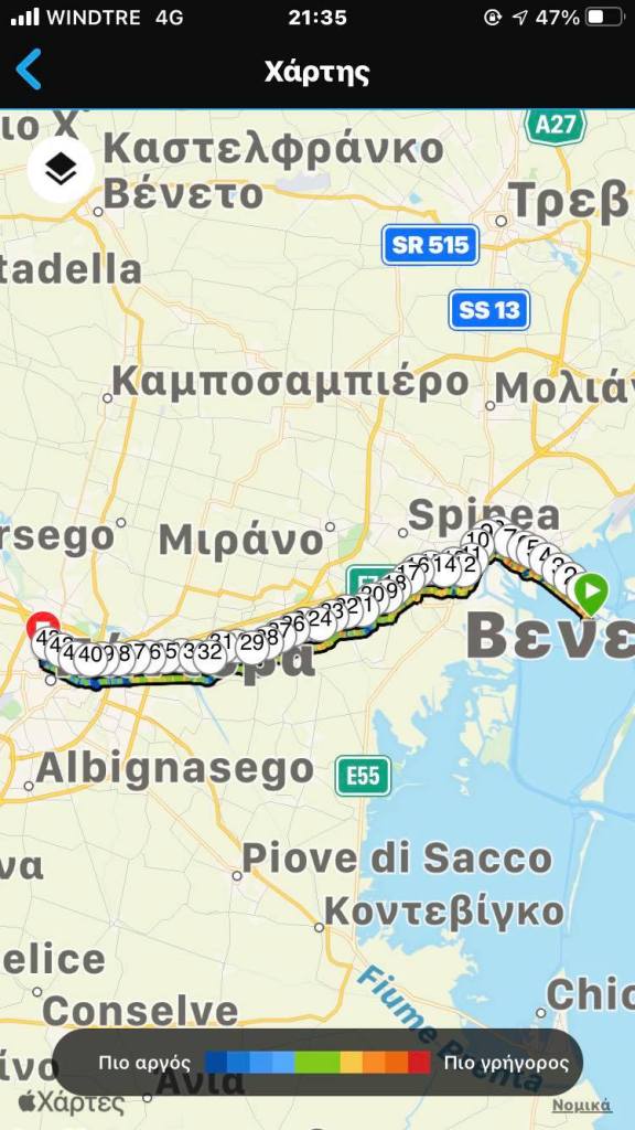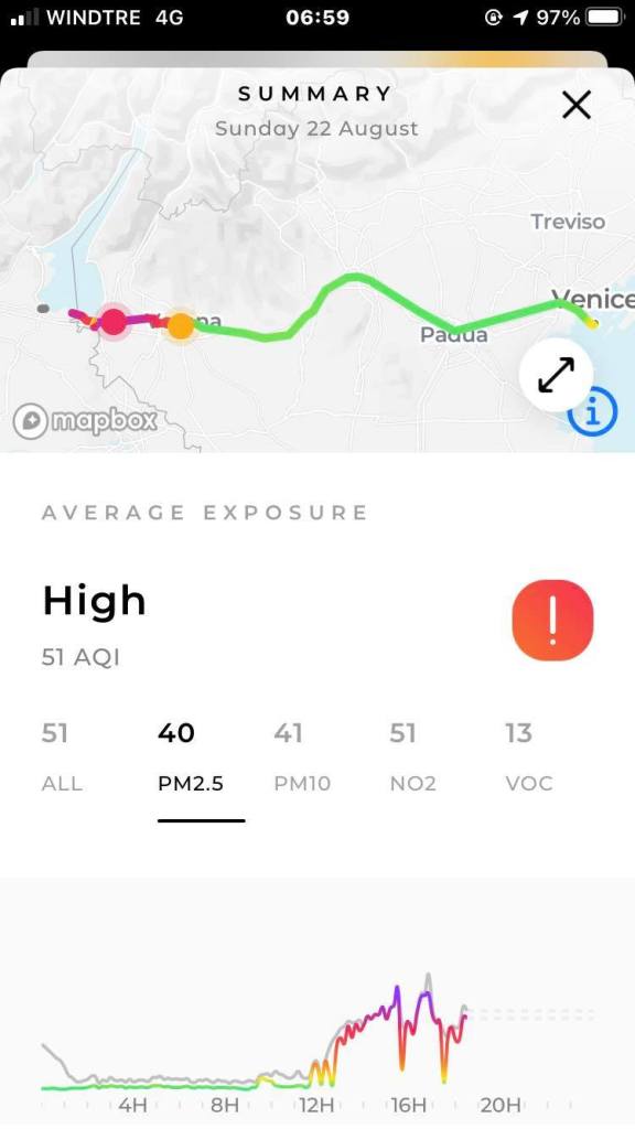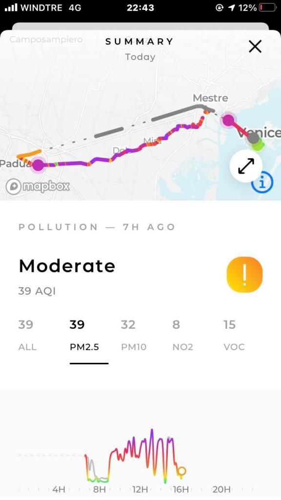The PM2,5 average between the moment Agis started in Venice at 8:57AM and when he finished in Padova at 14:36PM was 59,2 μg/m3. This is a level of Air Pollution six times higher than the safety level set by the WHO, and running under these conditions is unhealthy. Best PM2,5 value was, but just for a very short time, 1,9 μg/m3 and the worse was as high as 188,8 μg/m3.