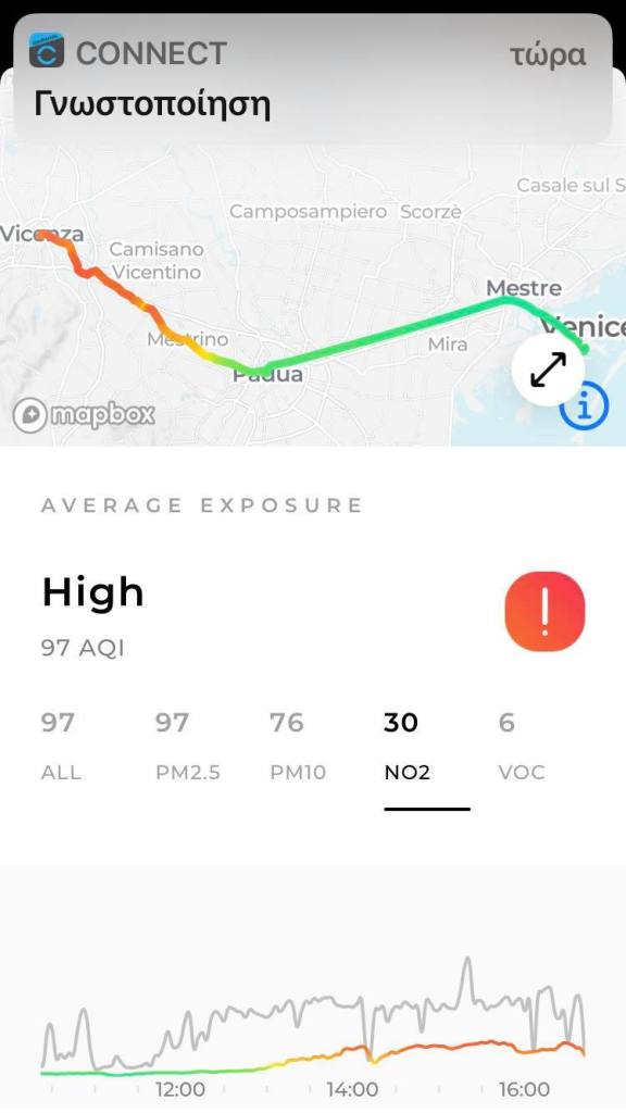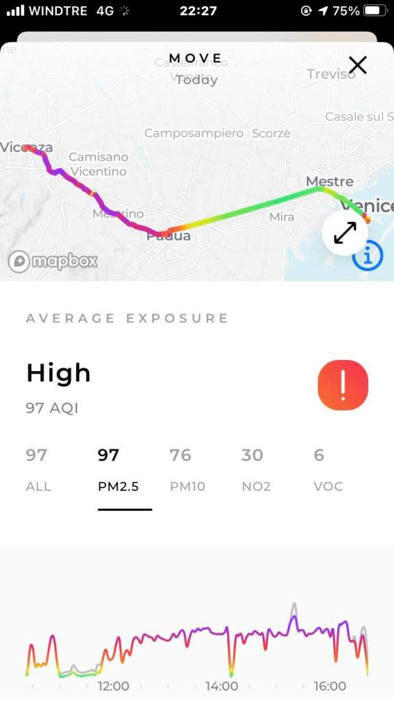 The PM2,5 average between the moment Agis started in Vicenza at 12:28PM and when the AQ Monitor stopped sending data to the phone along the way at 16:39 was 67 μg/m3. This is a level of Air Pollution almost seven times higher than the safety level set by the WHO!, and running under these conditions is unhealthy, once again. Best PM2,5 value was 2,9 μg/m3 (just for a very short time) and the worse was as high as 222 μg/m3, the worse of all days until now.
