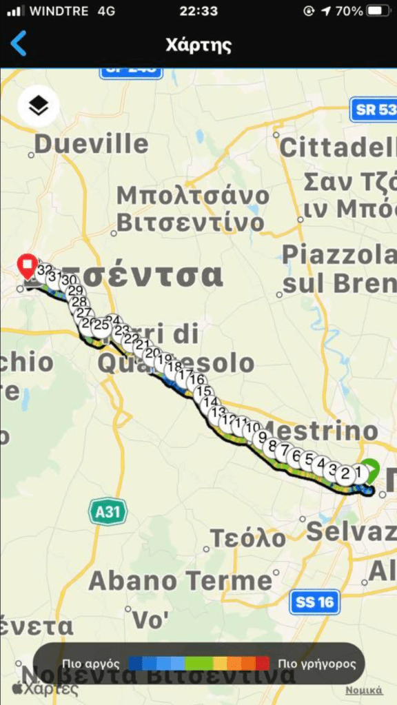 Here is the map with Agis’ course and running stats for Day 10, Padova-Vicenza: