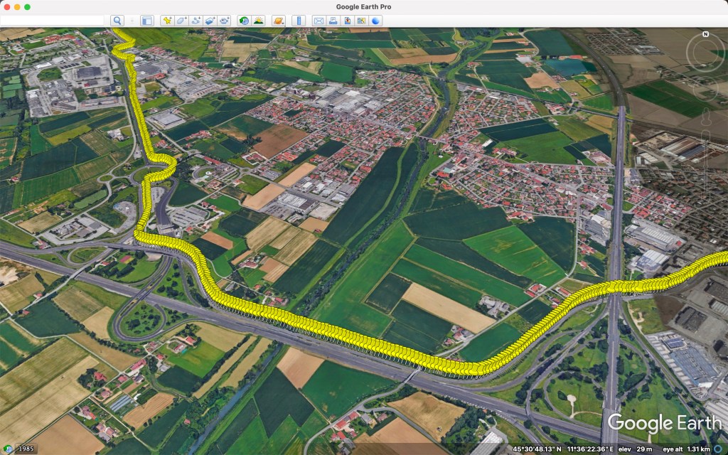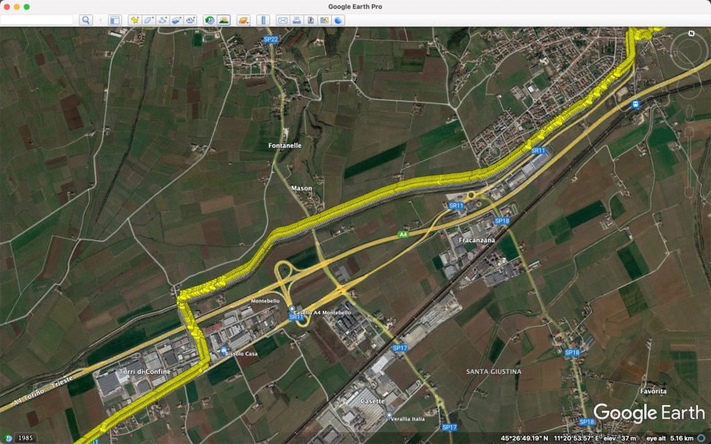 As can be seen in the satellite images above, Agis ran on Day 11 along a State Road that is very close to the A4 Torino-Trieste Freeway. Traffic pollution is very high along both roads, and Agis’ AQ Monitor picked up both particulate and NO2 pollution very well. There are also many industries in the region.