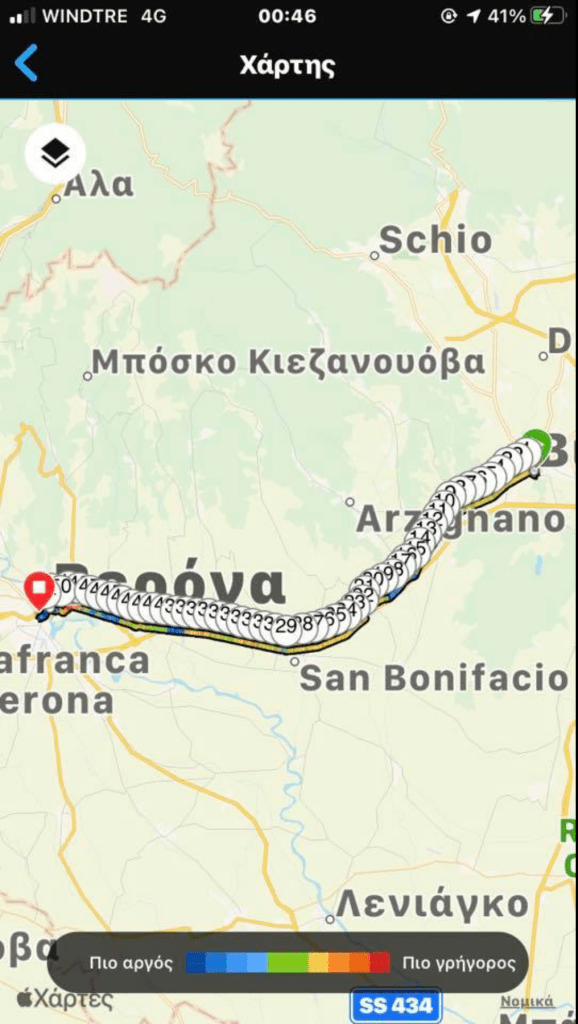 Here is the map with Agis’ course and running stats for Day 12, Verona-Brescia, with a 2h stop at Desenzano del Garda: