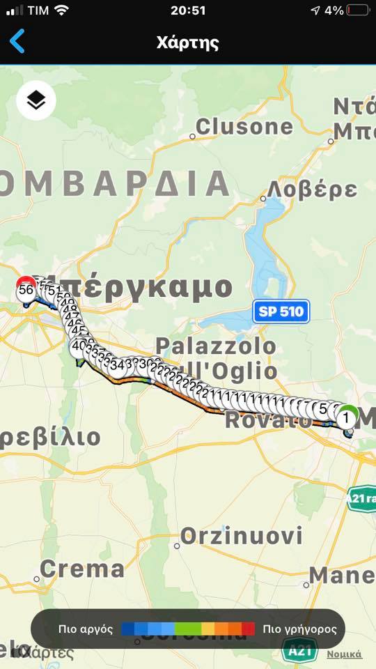 Nevertheless, here is the map with Agis’ course and running stats for Day 15, Brescia-Bergamo:
