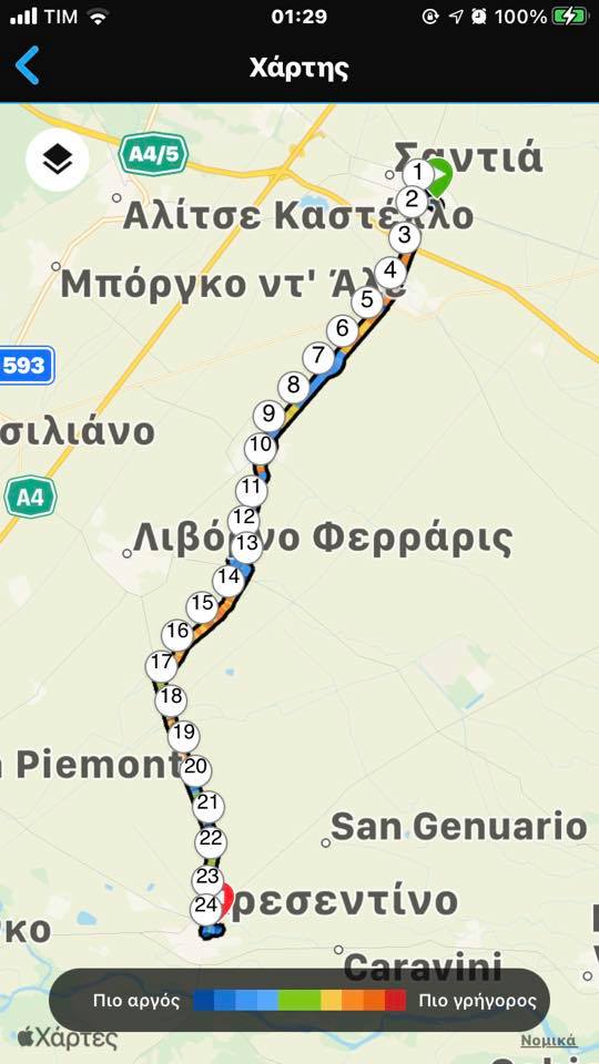 Here is the map with Agis’ course and running stats for Day 28, Torino-Crescentino: