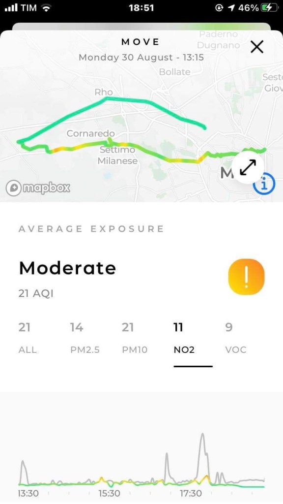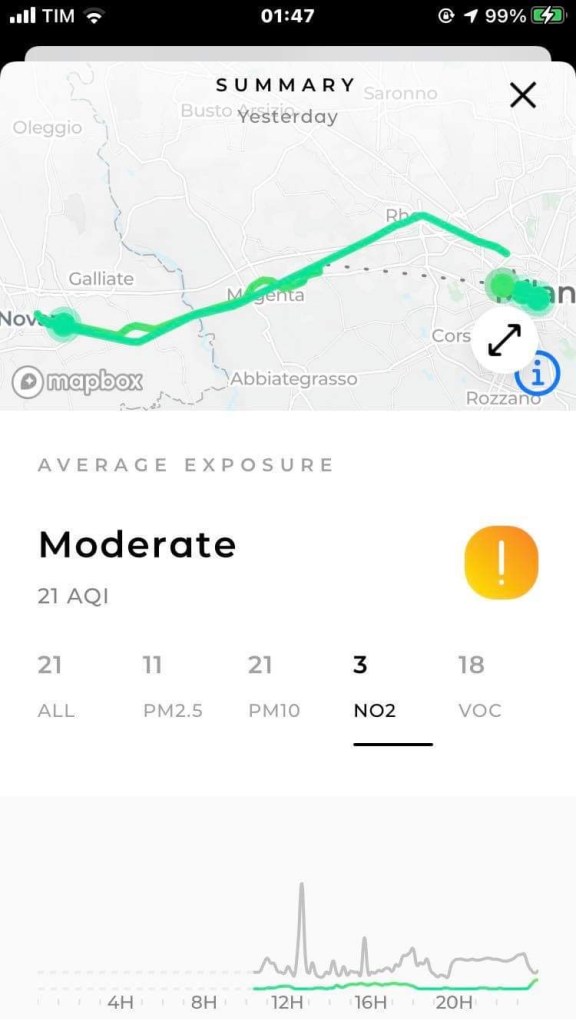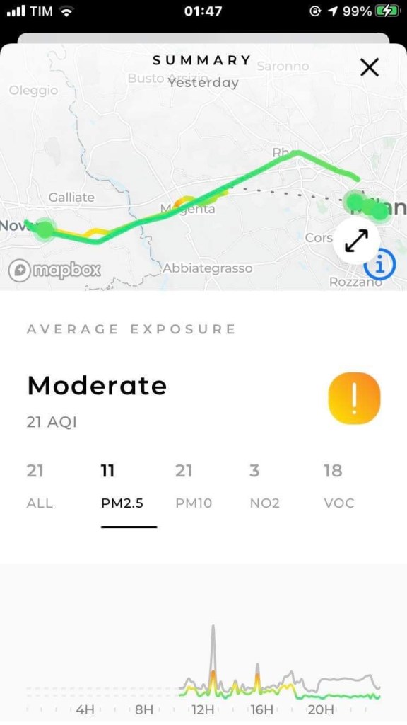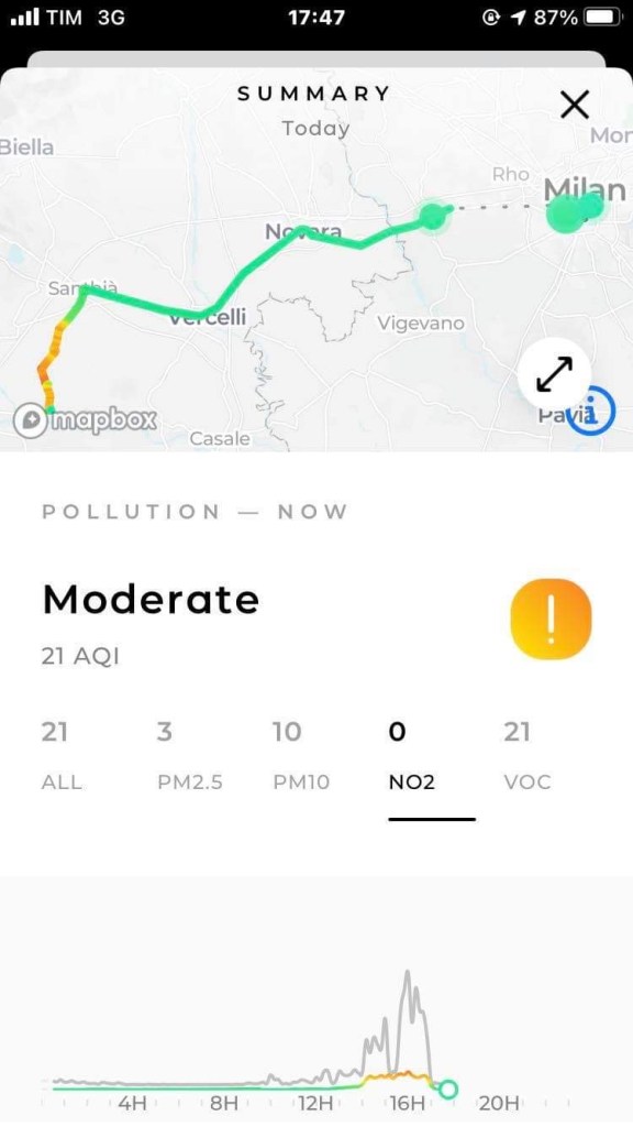 Agis started in Novara with relatively high levels of Air Pollution. But as soon as he distanced himself from the city and began running among agricultural land, the Air Quality improved to good levels. We all know that urban areas with their thousands of fossil fuels burning vehicles are a big source of Air Pollution, and this example makes it very clear. As a matter of fact, if we decided to suddenly stop burning fossil fuels in our cities, the Air Quality would tremendously improve overnight! And of course we would also drastically reduce the amount of CO2 that we pour into the atmosphere daily.