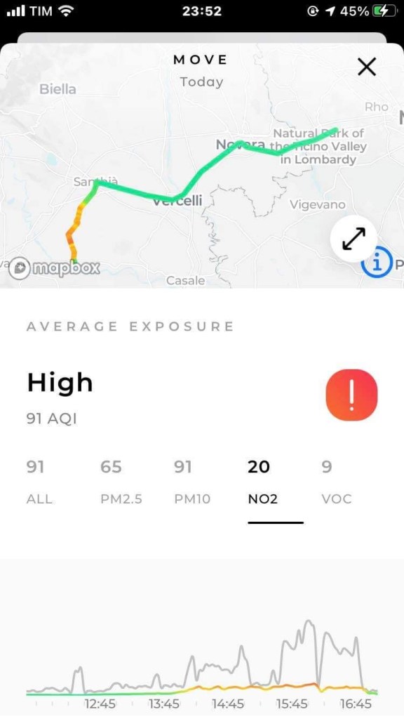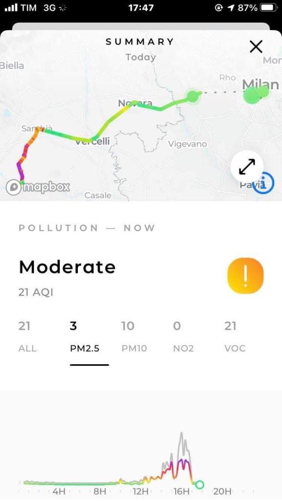 The PM2,5 average between the moment Agis started in Novara at 13:02PM and when he finished in Santhia’ at 20:09PM was 15,7 μg/m3. This is a level of Air Pollution that while it is 1,5 times higher than the safety level set by the WHO (10 μg/m3), is still considered safe by the EU standards (which sets the safety limit at 25 μg/m3). Yet, research shows that every increase of even 1 μg/m3 has an impact on our health, and that anything above 10 μg/m3 may cause harm. It follows that the EU should adopt stricter AQ standards! Best PM2,5 value was 1,2 μg/m3 and the worse was 120,7 μg/m3.