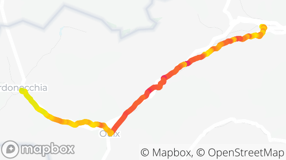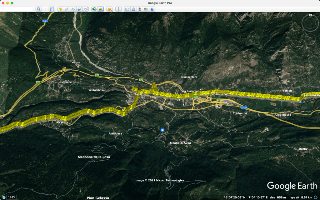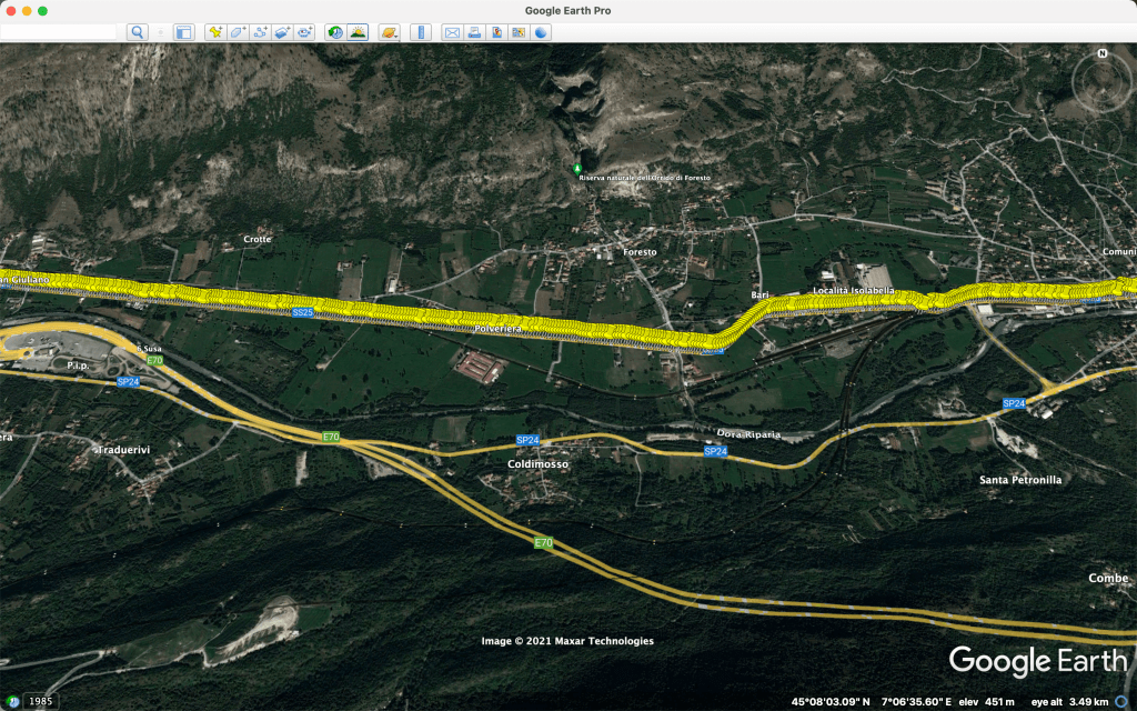 The satellite images above show Agis’ track in the upper Susa valley. Here the valley is narrower, and in parts the freeway, the train tracks and the State Road (the one were Agis was running on) are running very close to each other. Not the idillic icon you would expect in an Alpine landscape… The heavy traffic takes its toll on the valley, as we can also see from Agis’ AQ Monitor data. NO2 is especially high, something that you would never expect in a forested Alpine valley.