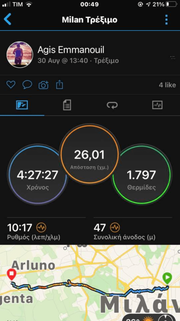 Here is the map with Agis’ course and running stats for Day 19, Bergamo-Milano: