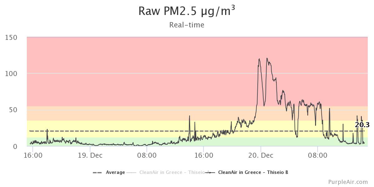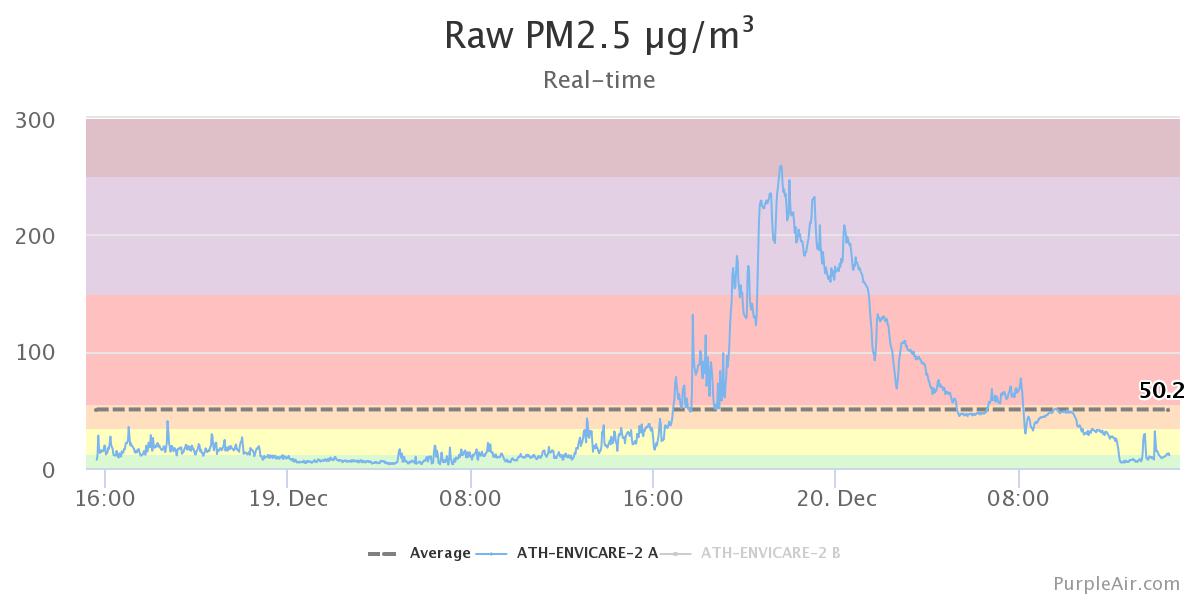 Two nights ago we had in Athens the highest Air Pollution spell of the winter. Wood smoke smell was intolerable allover the city. PM2,5 concentrations in Thiseio (central Athens) climbed to over 100 μg/m3 for the first time this winter (first Purple Air chart here below), and in Nea Irakleio they went to over 250 μg/m3 (second chart). These are huge concentrations, considering that the safety limit set by the WHO (World Health Organization) is 5 μg/m3. Not 50, not 500, but 5! That’s fifty times lower that we had two nights ago…