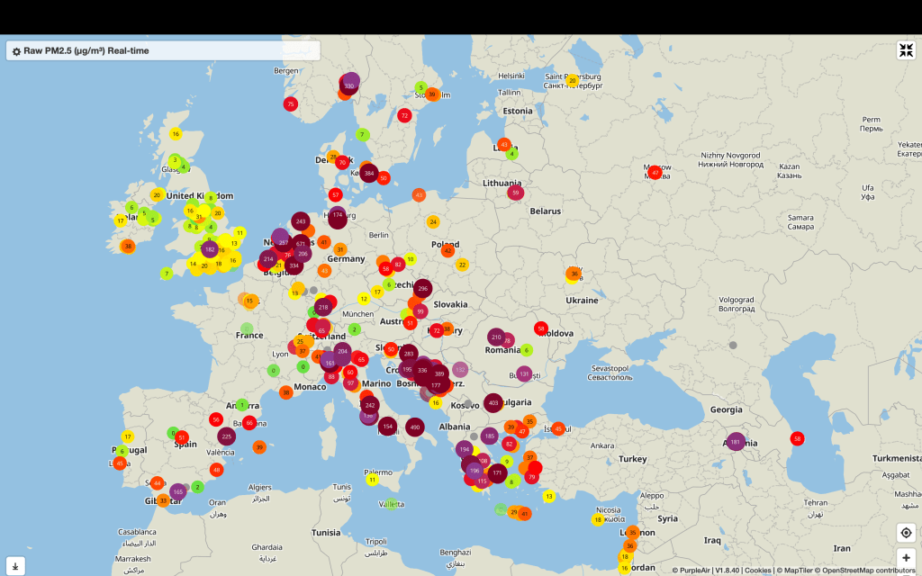 The numbers in the map show the concentrations of Particulate Matter PM2,5. The World Health Organizations states that the safety limit is below 5 μg/m3. Athens and most cities in Greece go over 100 μg/m3 every night in winter because of wood burnt in fireplaces and wood stoves. Last night they were just short of 400 μg/m3. And the whole of Europe had very high Air Pollution levels too.