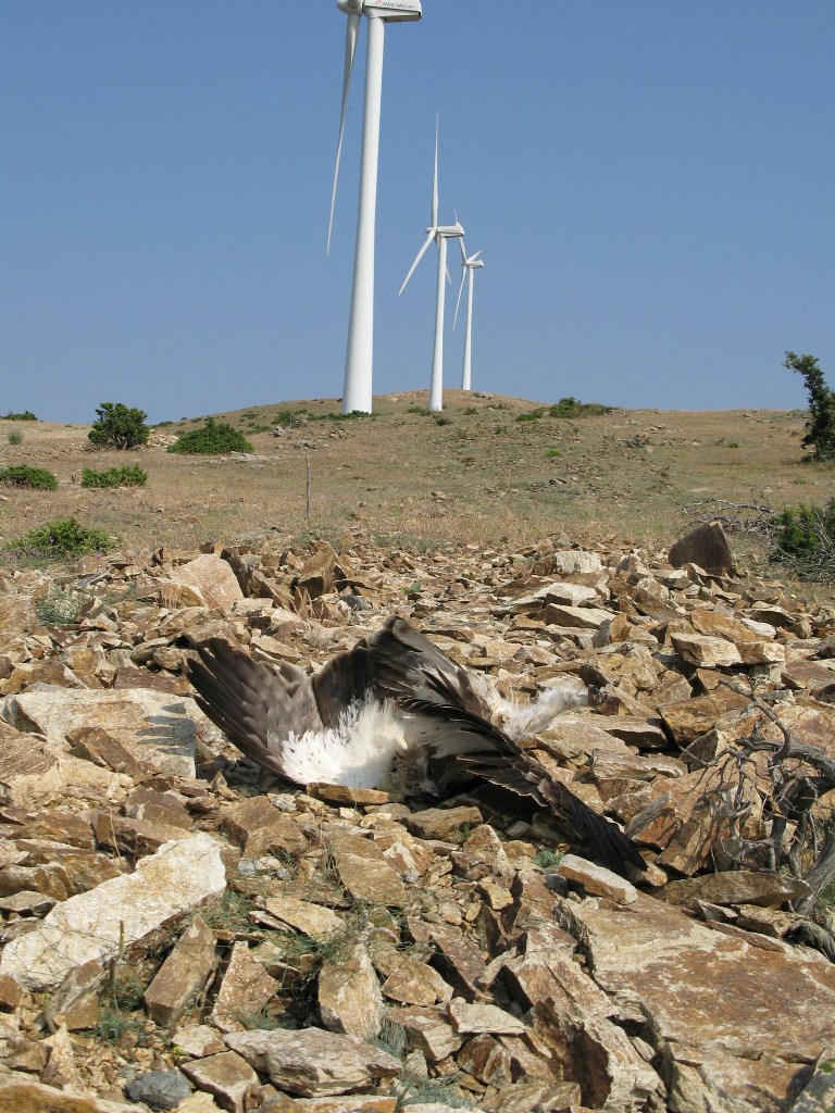 The answer is that so many of the wind farms that produce that renewable energy have been built (and many will be built) even inside natural protected areas and National Parks. They have ruined beautiful remote landscapes, mountain tops and islands, and they are killing hundreds of birds, including endangered ones like raptors. Just because in Greece anything is possible.